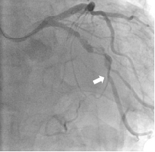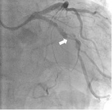 A TruePhysio® pressure microcatheter was advanced in the LCX but could not go any further due to severe stenosis and calcification. The location it reached is shown by the arrow in Fig. 3.