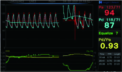 TruePhysio® pressure microcatheter was delivered to the distal segment of the Posterior descending artery (PDA). After inducing hyperemia, FFR = 0.70